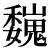 《說文》 —— 牛威切 —— 徐鉉曰:今人省山,以爲魏國之魏。〇【按】《集韻》「巍,或作嵬」,通作魏。《正韻》七灰,巍、嵬、魏𡘋收,魏註引《莊子》魏然而已,七隊獨收魏,魏姓、魏國不借巍。吳元滿《總要》附會《說文》魏音胃,以《周禮》象魏之魏、魏姓、魏國皆作,非。