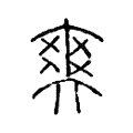 附注《說文新證》:「甲骨文从大,腋下挾二器(較像豆形,變化多端),以會左右相配、輔相之意。器形逐漸訛變,遂成二爻形。假借為『明亮』,西周中免簋作『』,係改造成从日喪聲的形聲字,惟此形後世不傳。」